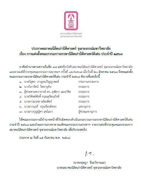 สมาคมนิสิตเก่านิติศาสตร์ จุฬาลงกรณ์มหาวิทยาลัย จะจัดให้มีการคัดเลือกนิสิตเก่าที่มีผลงานดีเด่นเป็นที่ประจักษ์เพื่อรับรางวัล “นิสิตเก่านิติศาสตร์ดีเด่น” ประจำปี 2568 by lawchulaalumni administrator on 04 November 2025 0 Comments Read more
